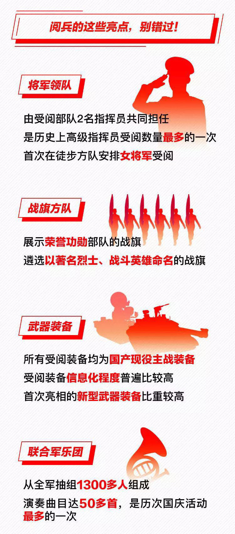 為慶祝新中國(guó)成立70周年,10月1日北京天安門(mén)廣場(chǎng)將舉行盛大閱兵式。屆時(shí),32個(gè)裝備方隊(duì)、12個(gè)空中梯隊(duì)將通過(guò)天安門(mén)廣場(chǎng),接受檢閱。此次閱兵,所有受閱裝備均為國(guó)產(chǎn)現(xiàn)役主戰(zhàn)裝備,其中包括我軍部分新型裝備,是近幾次閱兵中規(guī)模最大的一次。